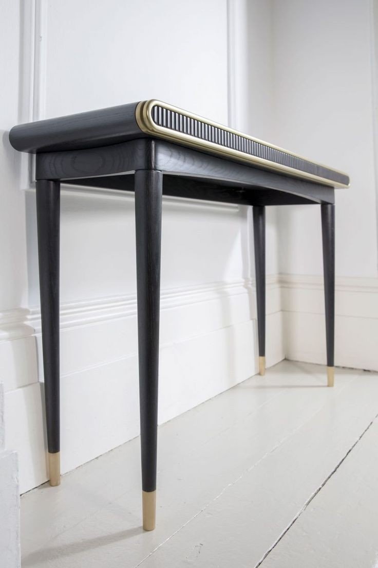 The design is grounded by slender, tapered legs that end in matching brass-capped feet, adding a touch of Art Deco glamour to the modern silhouette. Its slim profile makes it an ideal choice for narrow hallways or as a statement piece behind a sofa. At Casa Lusso, we believe every corner of your home deserves a touch of opulence.