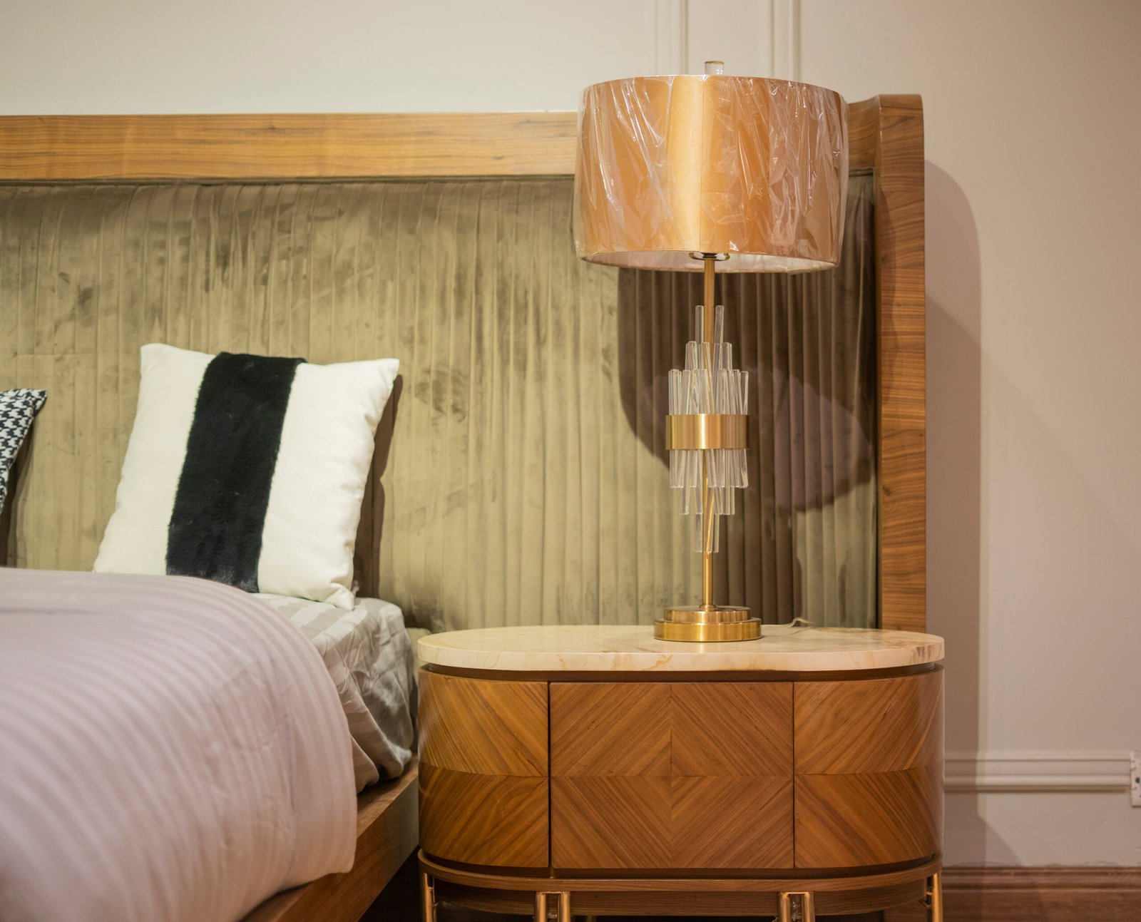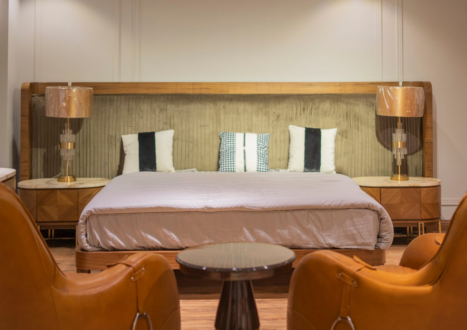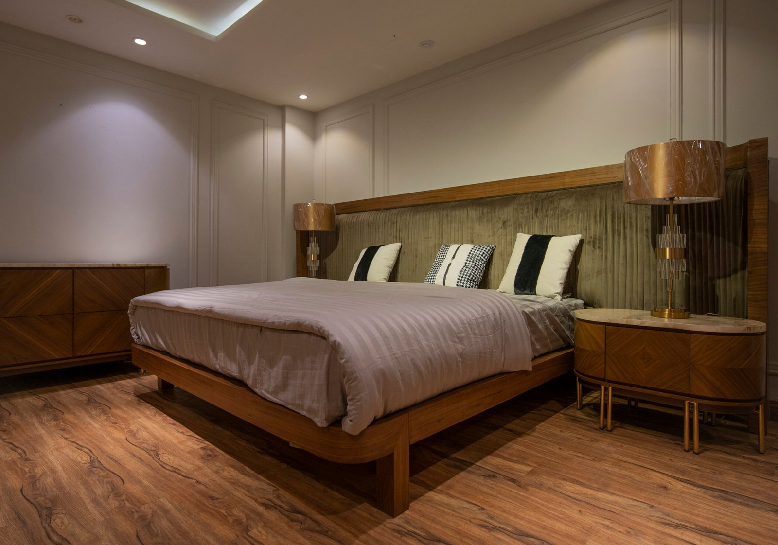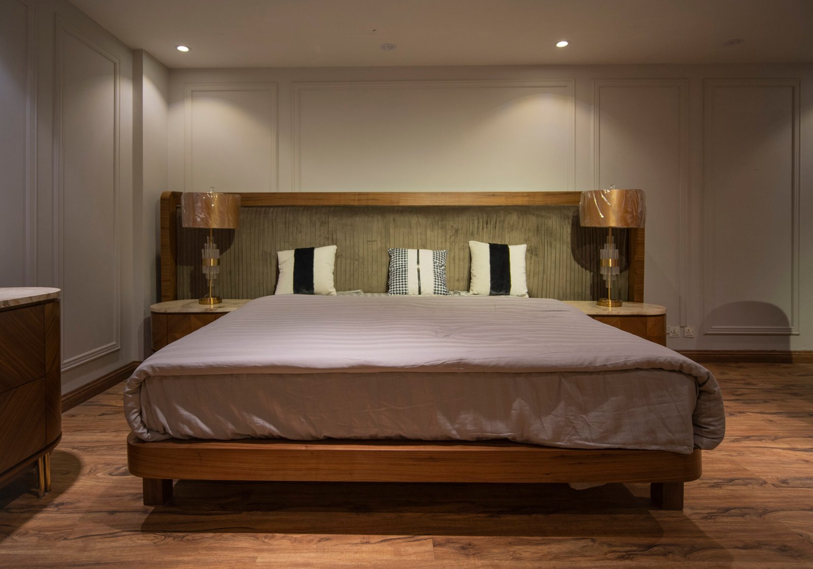 A premium Gada-style bed set featuring a large padded headboard, wooden frame, and elegant integrated side tables  designed to bring a luxurious and modern touch to your bedroom.