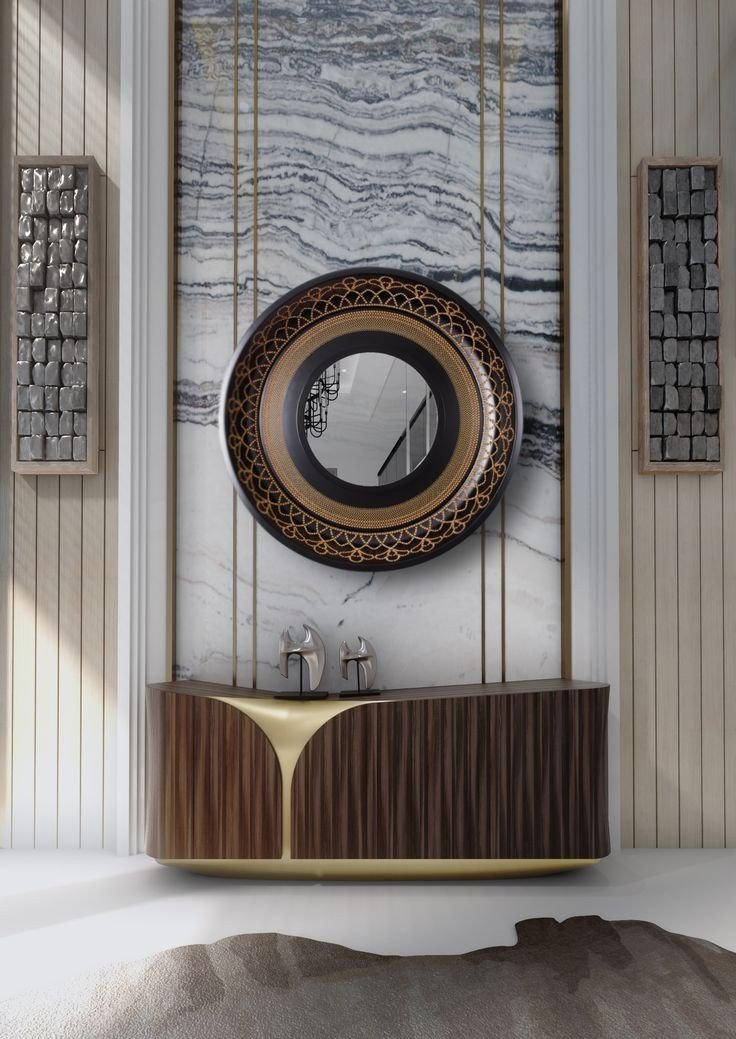 Above, the statement round mirror features an intricately patterned gold-accented frame, designed to reflect light beautifully while serving as a captivating focal point. Set against marble-inspired back panels, this ensemble brings depth, luxury, and sophistication to any living space, foyer, or formal lounge.