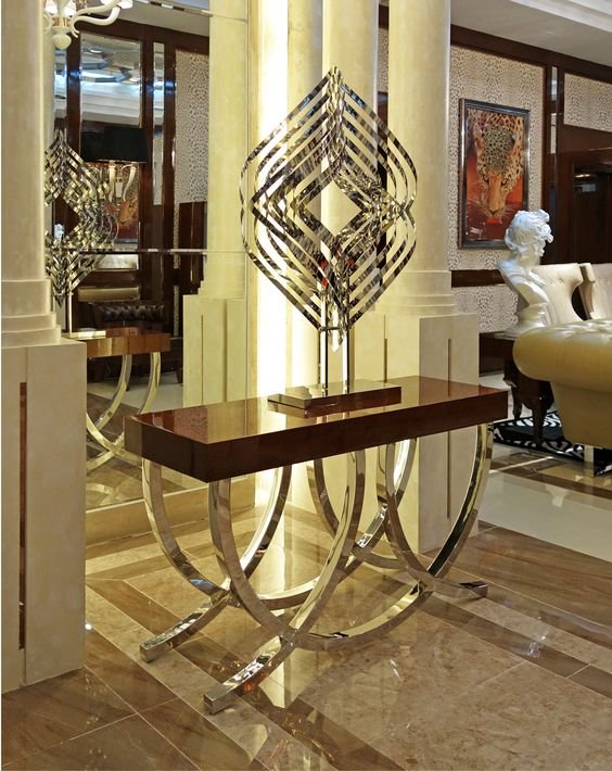 A striking luxury console table featuring a polished wooden top and sculptural stainless-steel base, designed to elevate grand interiors with timeless sophistication.