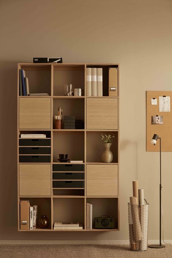 A minimalist modular book rack with open shelves and closed storage, designed for modern homes and organized living.