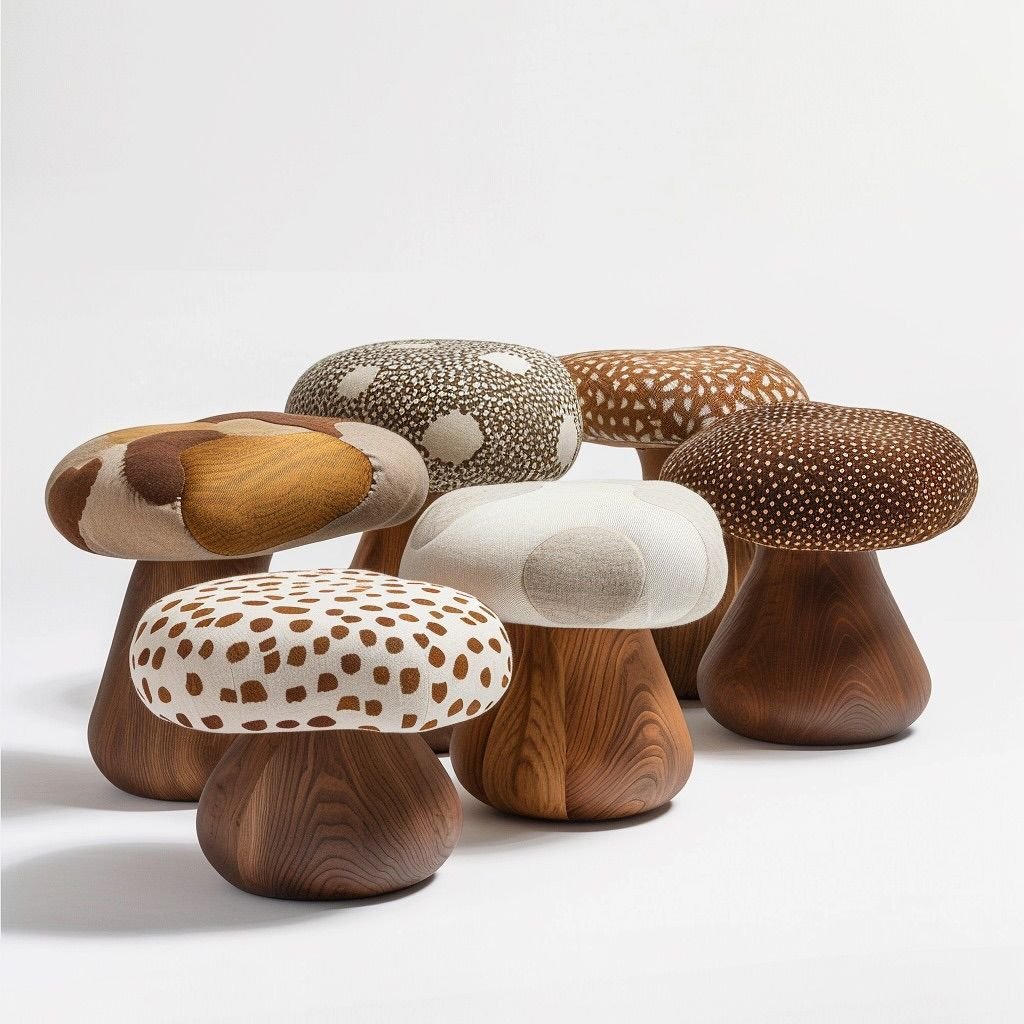 Bring nature-inspired design into your space with this mushroom-inspired upholstered stool collection. Featuring soft, rounded seats paired with beautifully crafted solid wood bases, each piece is a functional sculpture that blends comfort with contemporary artistry.
