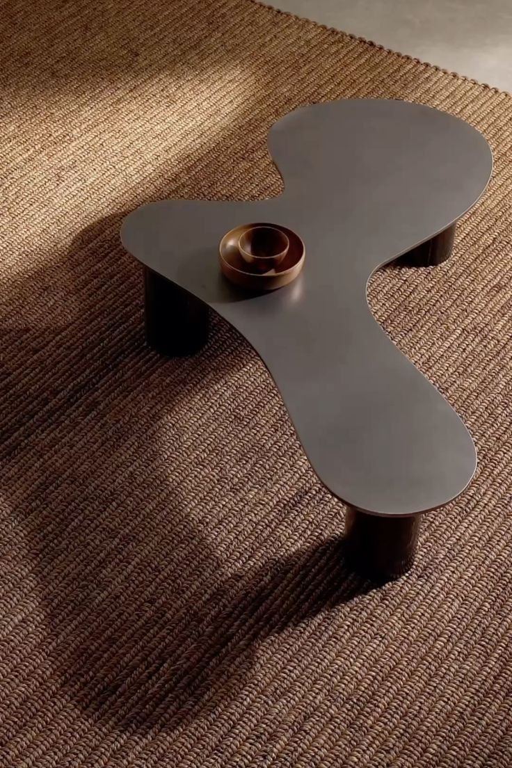 Set against a textured woven rug, the table becomes a grounding centerpiece ideal for contemporary, minimalist, or wabi-sabi inspired interiors. Its low height encourages relaxed seating arrangements, while the generous surface accommodates decorative objects, books, or daily essentials. The design emphasizes balance and negative space, making it as much a statement piece as it is a functional one.