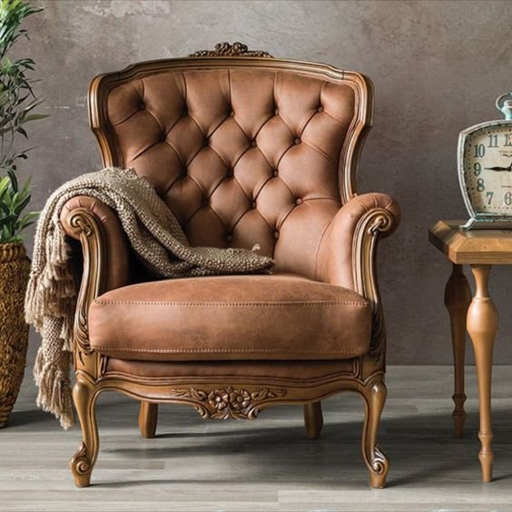 Bring timeless elegance into your space with this Vintage Tufted Armchair, crafted with a beautifully carved solid wooden frame and upholstered in premium leather. The deep diamond-tufted backrest, rolled arms, and classic French-style legs create a luxurious and comfortable seating experience. Perfect for living rooms, lounges, and statement corners.