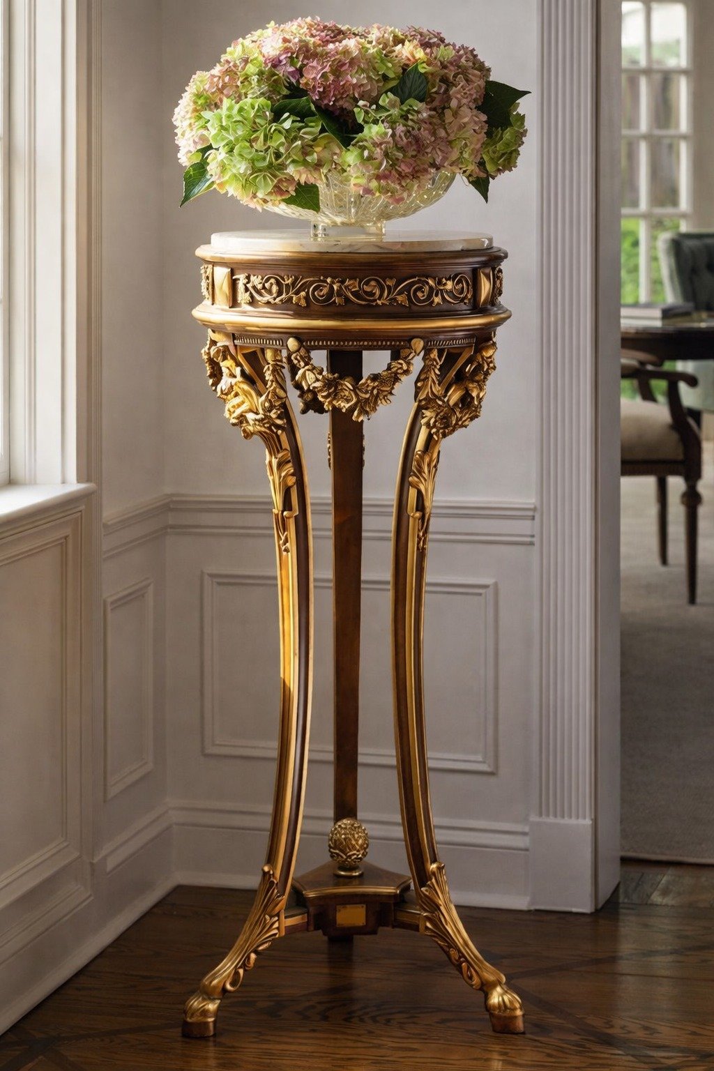 The Regal Gilded Pedestal Table is a statement of classic luxury and artisanal craftsmanship. Meticulously detailed with ornate gold-finished carvings, its slender sculpted legs and decorative motifs reflect the grandeur of European palatial design.