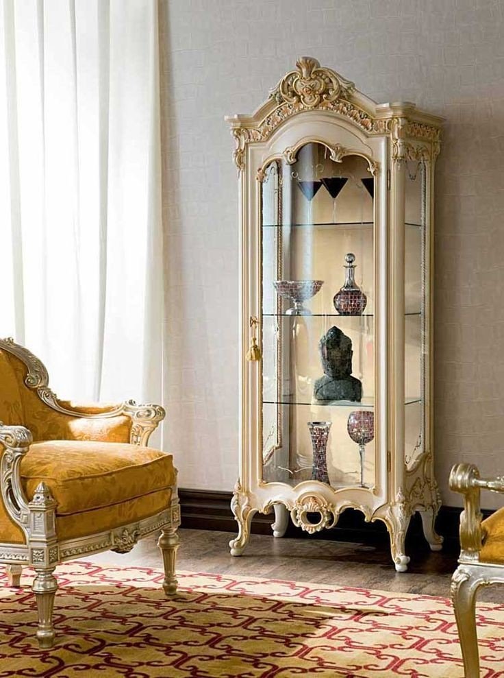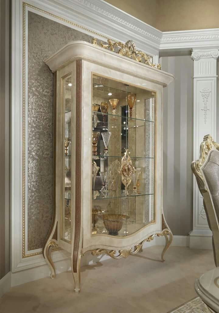 This refined glass display cabinet embodies timeless luxury and classic craftsmanship. Finished in a soft ivory tone with intricate gold accents, it features a Greek key motif along the crown and delicately embellished trim throughout. The clear glass doors and shelves provide an unobstructed view of displayed crystal, porcelain, or collectibles, while integrated interior lighting enhances brilliance and depth. Supported by subtly tapered legs, the cabinet balances grandeur with elegance, making it an ideal centerpiece for formal dining rooms, salons, or sophisticated living spaces.