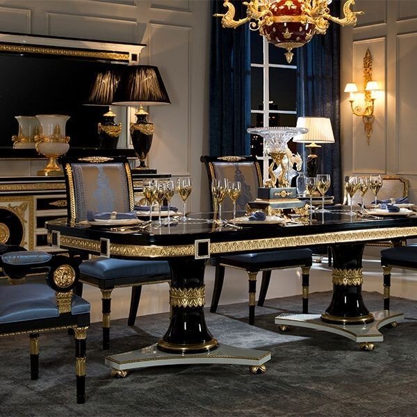 The dining table showcases a high-gloss polished surface supported by intricately carved golden legs that ensure strength, durability, and a luxurious presence. This set is perfect for formal dining rooms, luxury homes, hotels, and high-end interiors where elegance and craftsmanship matter.