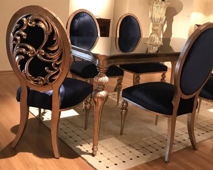 Transform your dining area with this Royal Blue Velvet Carved Dining Set, crafted with timeless elegance and premium craftsmanship. The set includes six beautifully upholstered chairs featuring deep blue velvet fabric, offering exceptional comfort and a sophisticated look. Each chair is framed with hand-carved wooden detailing finished in an antique gold sheen, creating an opulent royal appeal.