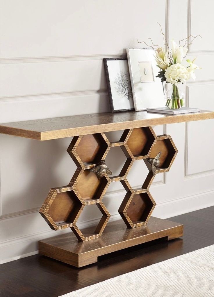 Bring the sophisticated beauty of the natural world into your home with the Apiary Sculptural Console Table. The piece is defined by its intricate base, an architectural feat of interlocking hexagonal cells crafted from rich, warm-toned walnut wood with an aged finish. This complex geometric lattice supports a substantial wood top and rests on a solid plinth, offering a striking visual balance of open space and solid form. The design is whimsically yet elegantly completed by two artisanal, cast-metal bee sculptures that appear to alight upon the structure, adding a touch of aged bronze luster. This is a conversation-igniting piece that perfectly marries skilled woodwork with artistic imagination.