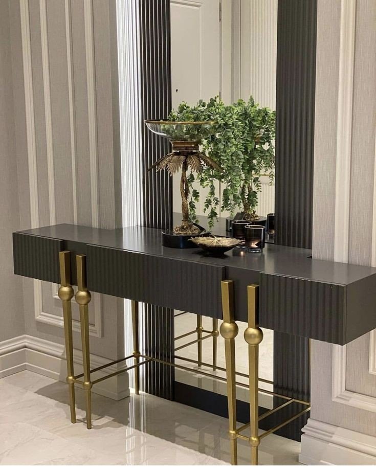 Introduce a rhythm of shadow and light to your interior with the Marcella Console Table. The cabinet body is wrapped in a tactile, vertical fluting finished in a deep, matte noir, creating a sense of height and contemporary sophistication. Supporting this textured expanse is a metallic base of brushed gold, characterized by slender vertical supports interrupted by ornamental spheres—a nod to celestial geometry. A delicate gold stretcher connects the legs, ensuring stability while adding a final stroke of metallic brilliance to the design.