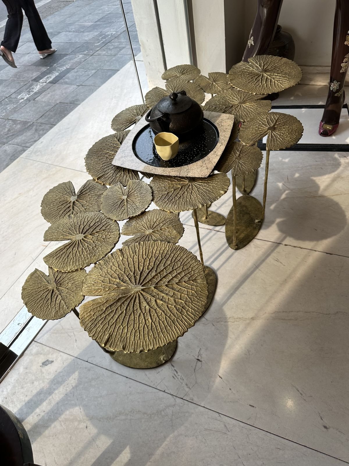 The table features a series of overlapping, pad-like surfaces, each intricately detailed with the veins and texture of a natural lotus leaf. Finished in an antique gold tone, the leaves are arranged at different heights on slender stems, creating a dynamic, multi-layered surface that is both visually light and structurally solid. It is perfect for use as an unconventional coffee table or a dramatic side table, providing multiple platforms for resting a cup of tea, a book, or decorative objets d’art.